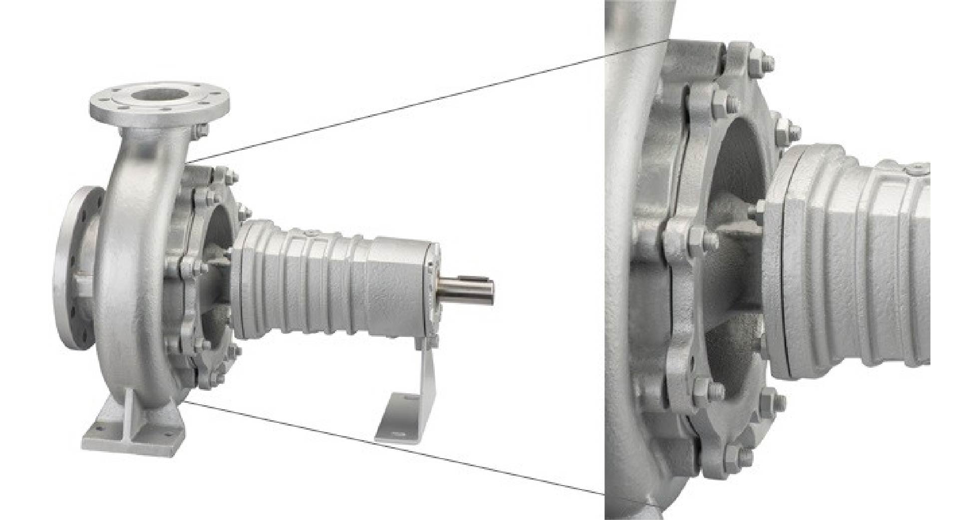 Álabes traseros y laberinto que protegen rodamientos y sellos.